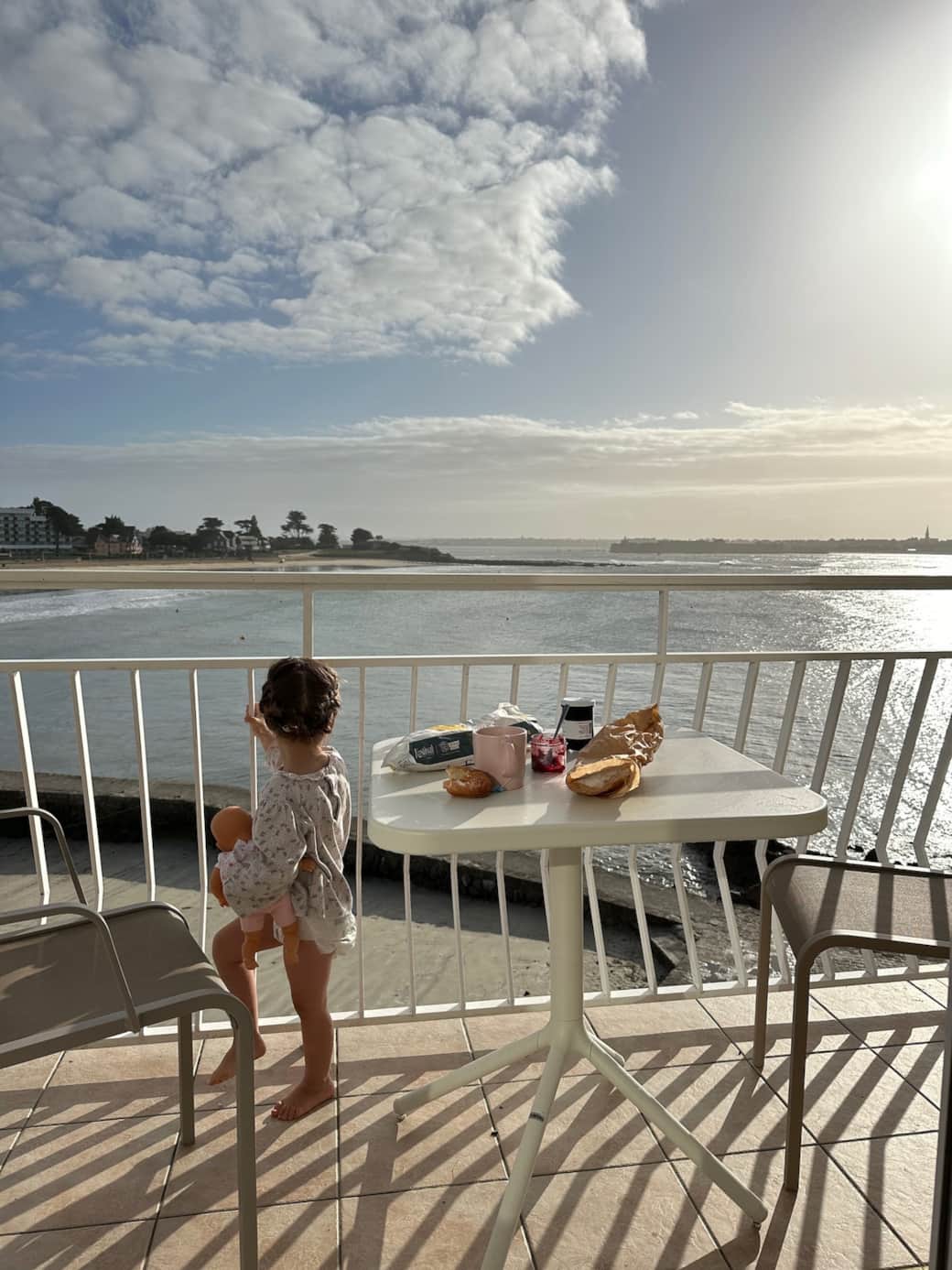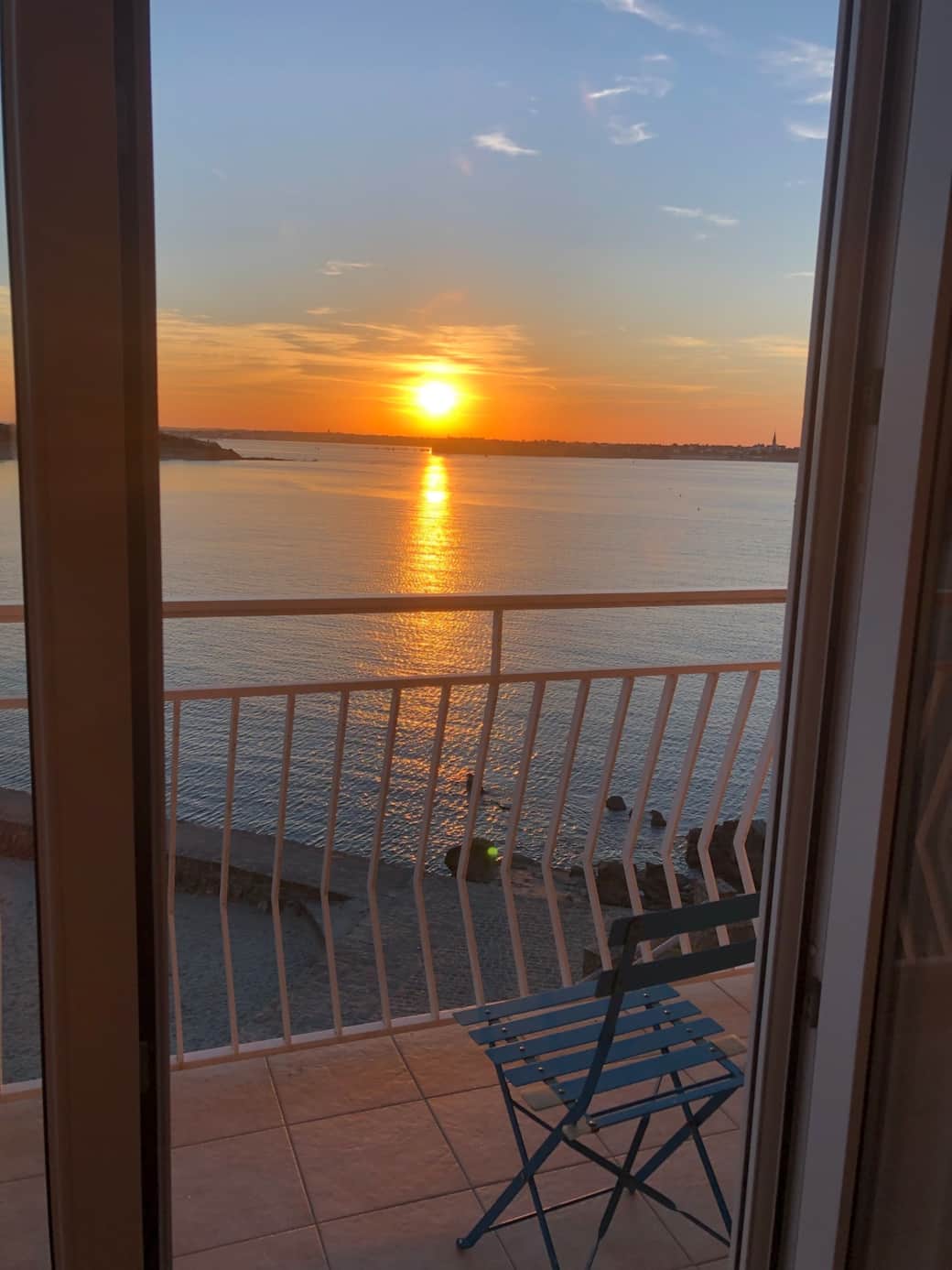 Vue mer depuis le balcon de la chambre. Deux bains de soleil